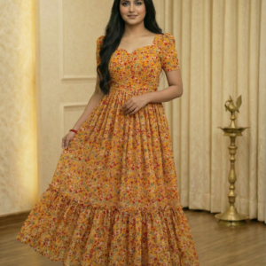 The mango yellow floral print georgette frock is the perfect addition to any wardrobe, combining vibrant color with a delightful pattern. Made from lightweight georgette fabric, this frock offers both comfort and style, making it ideal for warm weather. The cheerful mango yellow hue exudes a sense of joy and freshness, while the intricate floral print adds a touch of femininity and elegance.